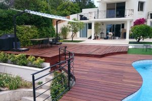 En pin, douglas, ipé ou bois composite, posées sur lambourdes ou plots réglables, résistantes aux intempéries.